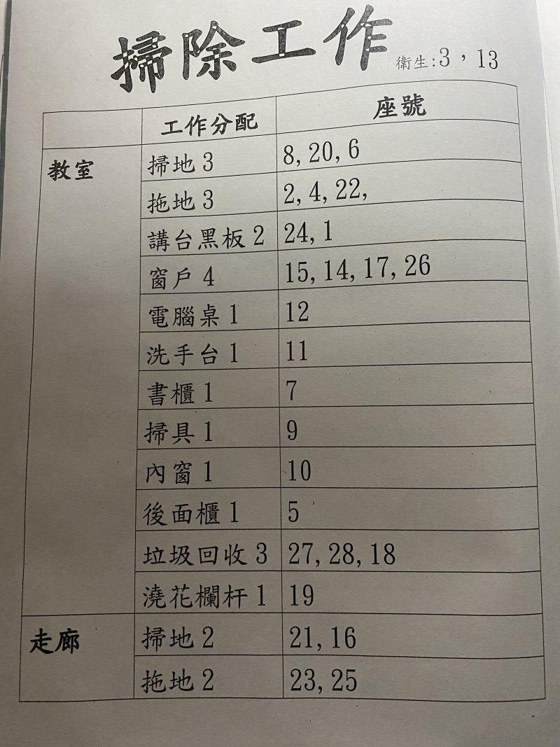 三年六班掃地區域責任區分表