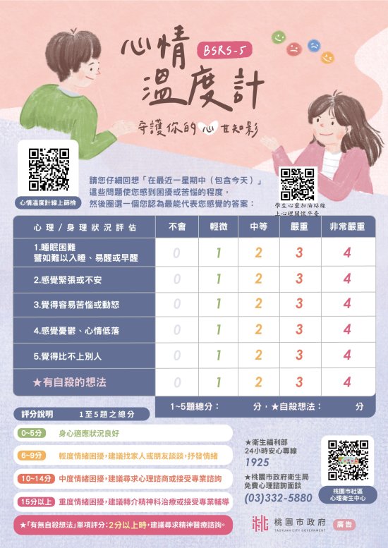二、 | 為利本府衛生局針對不同性別、年齡、居住區域等民眾進行其心理健康程度差異之統計分析,請貴校將旨案列入宣導活動或辦理課程時,請教師、學生或民眾使用心情溫度計( BSRS-5 )施測。 |