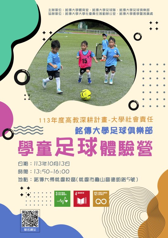 二、 | 本校體育室為善盡大學社會責任(USR)落實在地深耕,奠定基層運動風氣,並藉此達到推展健康社區之目標,擬訂於 113 年 10 月 13 日(星期日)下午 13:50-16:00 辦理免費足球體驗營,邀請桃園市國小及幼兒園學童踴躍參加。 |