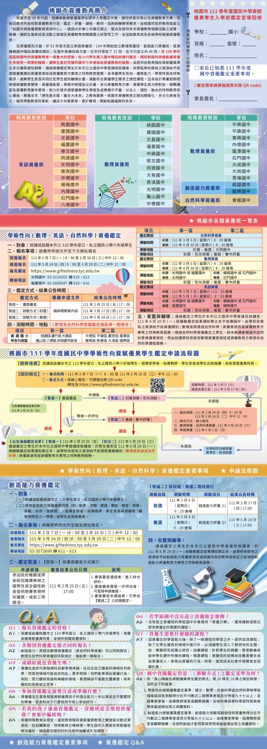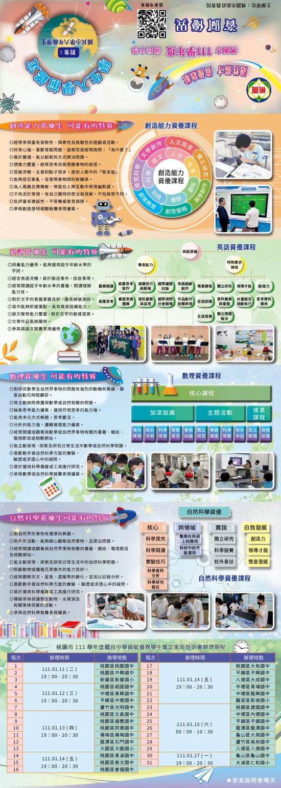 (3) | 創造能力資優鑑定:初選 111 年 3 月 6 日(星期日);複選 111 年 5 月 8 日(星期日)。 |