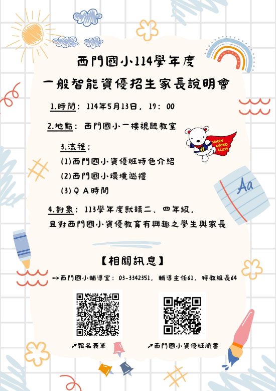 主旨:本校辦理「114 學年度西門國小一般智能資優招生家長說