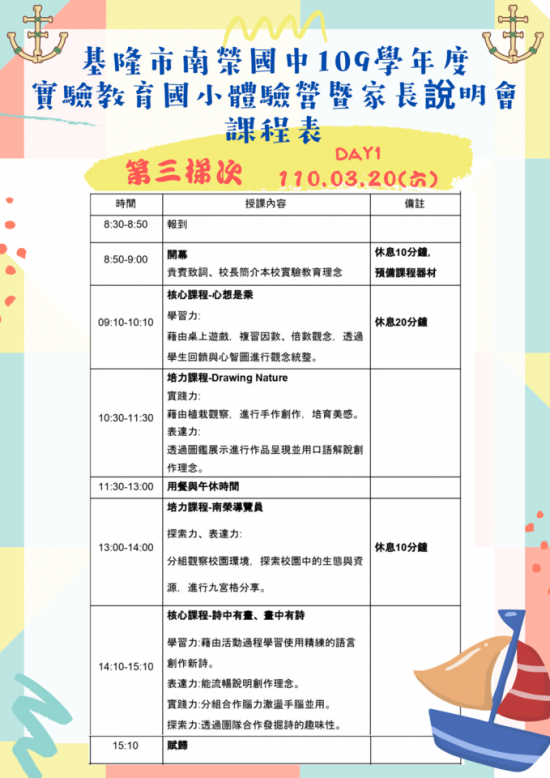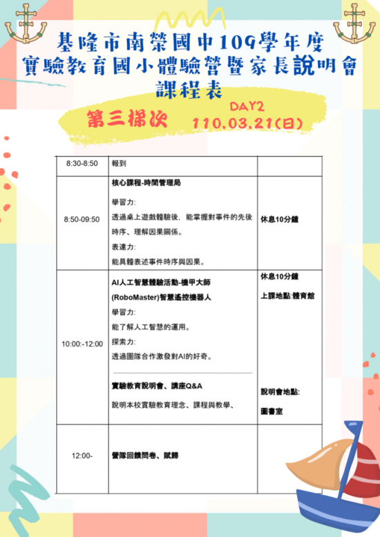 二、 | 基隆市南榮國中自 109 學年度轉型為學校型態實驗教育學校,以未來力教育作為特殊教育理念,連結既有領域課程,發展出「學習力」、「表達力」、「實踐力」與「探索力」四大課程架構之培力課程,期培養學生習得「適應未來能力」與「創造未來動力」;另為擴大推動實驗教育效益,使學生及家長透過課程體驗與理念說明,瞭解該校實際課程推動情況與做法,特規劃辦理學生體驗營與家長說明會。 |