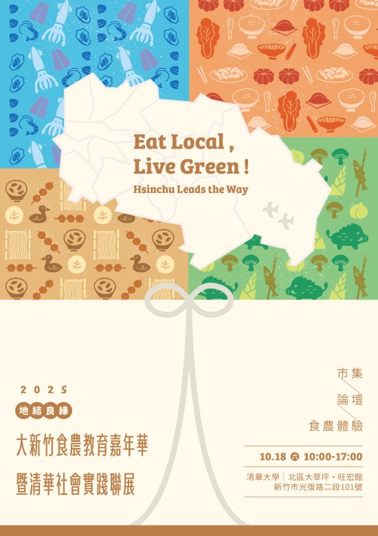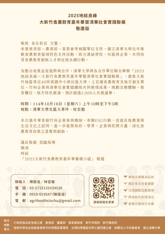 主旨: | 函轉教育部委託國立清華大學於 114 年 10 月 18 日(星期六)辦理「2025 地結良緣─大新竹食農教育嘉年華暨清華社會實踐聯展」活動,請貴校協助廣為宣傳,請查照。 |