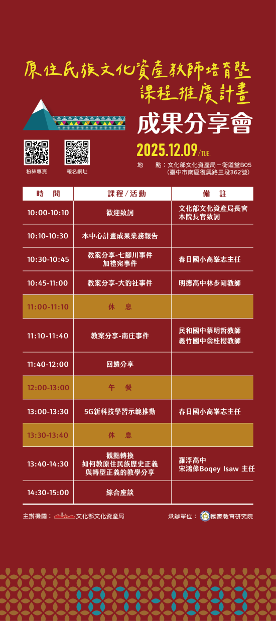 | (二) | 國教院原住民族教育研究中心吳小姐,聯絡信箱 yichiawu@mail.naer.edu.tw 、聯絡電話: 02-7740-7117 。 |